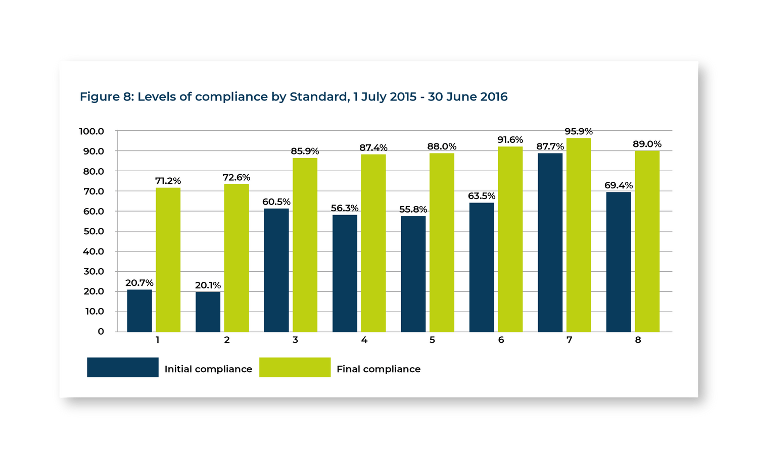 • Only 20.1% met compliance standards initially while only 72.6 passed at finalisation stage in Standard 2 Quality assurance